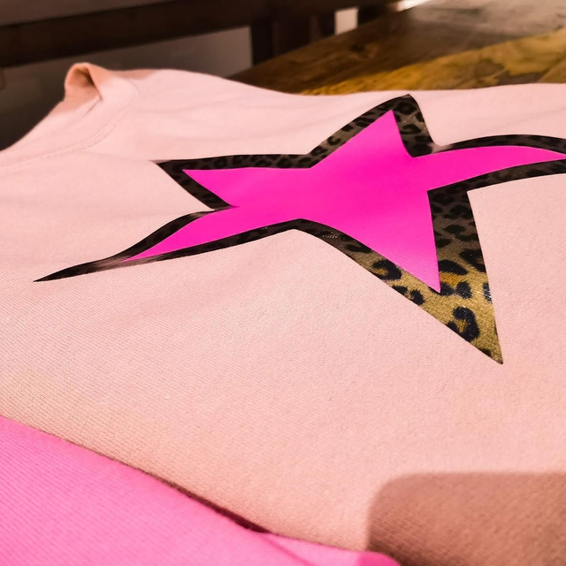 Gorgeous, bright ladies sweatshirt with pink neon star with a leopard outline.