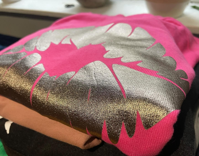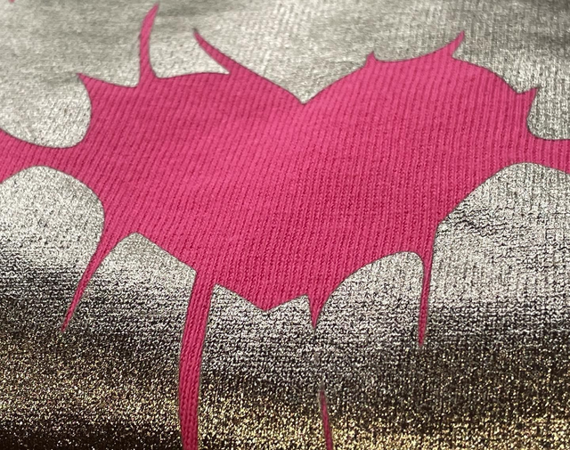Hot Pink Crew neck sweatshirt with Pewter colour lips with heart in the middle.